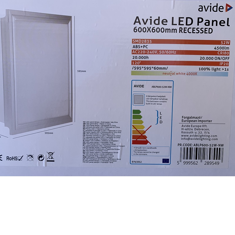 LED panel Avide 52W 4500lm Recessed 600×600